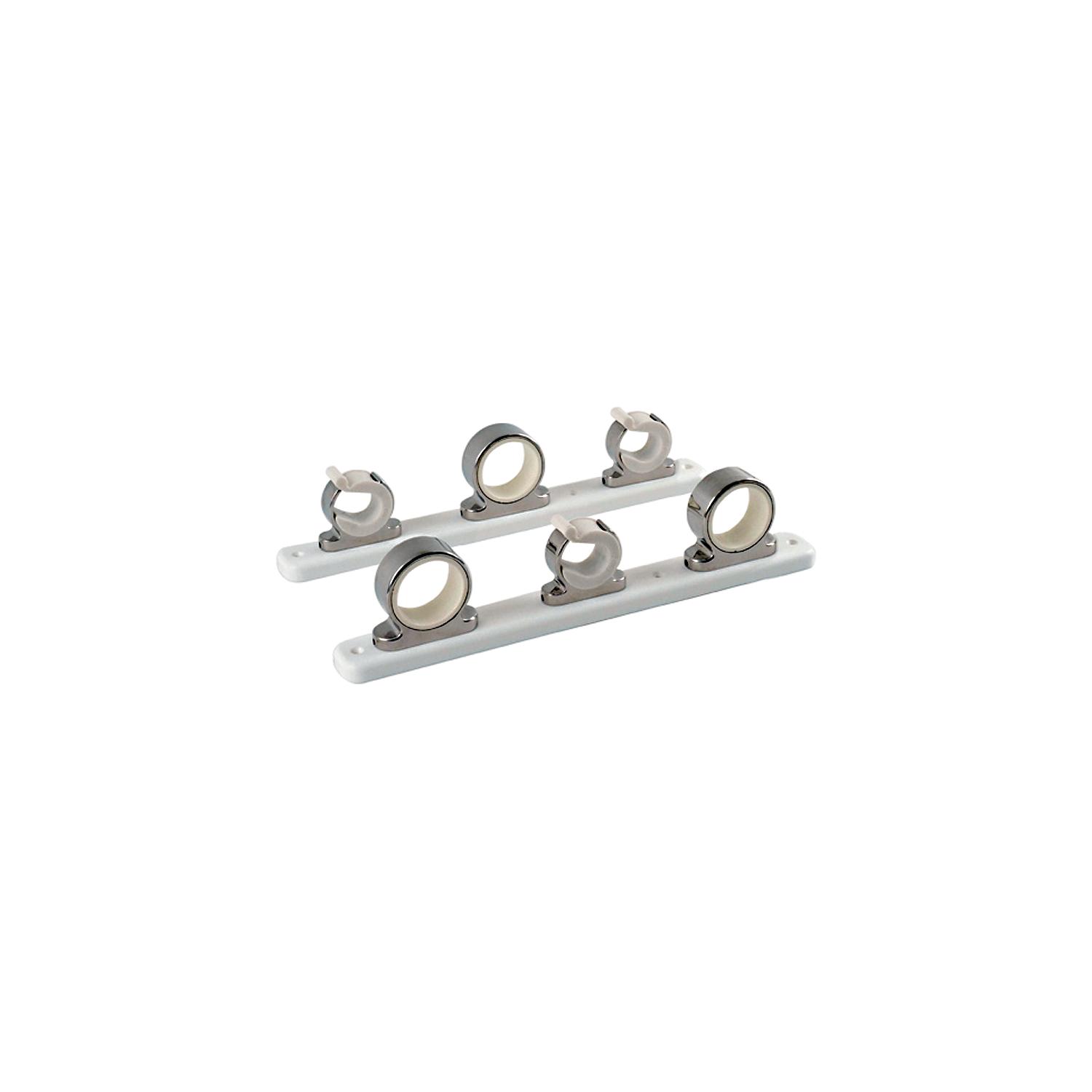 3-Rod Stainless Steel Rod Hanger Rack Rod-tip spring design securely locks rods in positon. Easy to install UV stabilized polyethylene racks available in two sizes for convenient 2-rod and 4-rod storage. Pre-drilled recessed mounting holes and beveled edges for clean, attractive look.Can be mounted horizontally, vertically or overheadSpring locking rod tip holderPolished stainless steel/Delrin rod hanger componentsUV-stabilized poly racks w/beveled edges offer a finished look