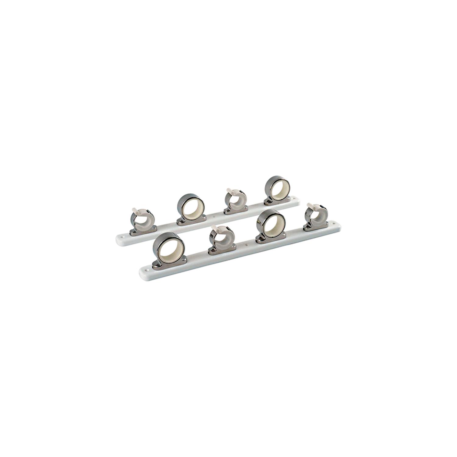 4-Rod Stainless Steel Rod Hanger Rack Rod-tip spring design securely locks rods in positon. Easy to install UV stabilized polyethylene racks available in two sizes for convenient 2-rod and 4-rod storage. Pre-drilled recessed mounting holes and beveled edges for clean, attractive look.Can be mounted horizontally, vertically or overheadSpring locking rod tip holderPolished stainless steel/Delrin rod hanger componentsUV-stabilized poly racks w/beveled edges offer a finished look