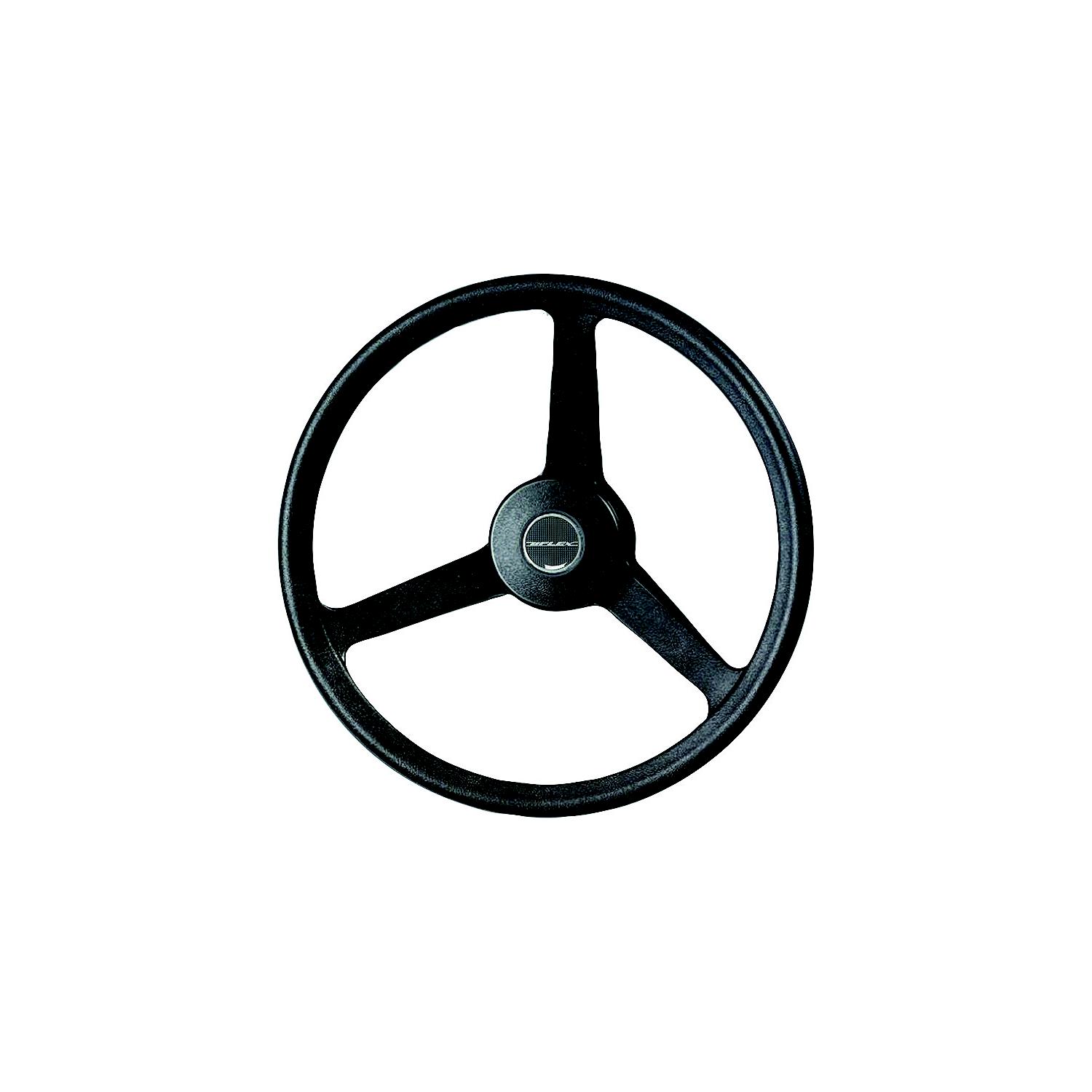 Black 3-Spoke Steering Wheel Fiberglass reinforced nylon steering wheels. Features 3/4″ tapered shaft that fits nearly every steering helm.