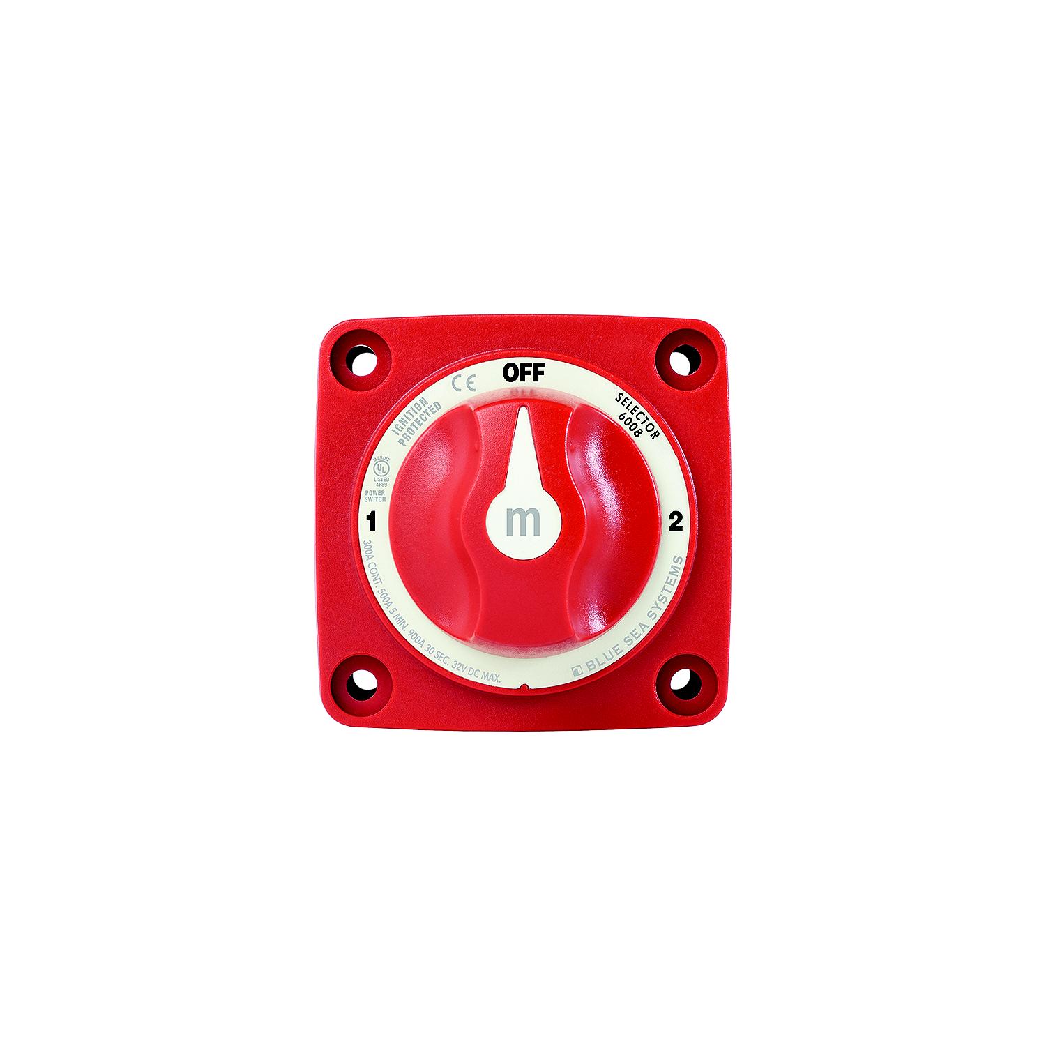 Blue Sea 6008 Battery Switch Mini 3-Position w/Knob, Red M-Series Selector Battery Switch (Mini) switches battery bank 1 or battery bank 2. Features make-before-break design. Rated for 300 amps, 500 intermittent, 1500 cranking.