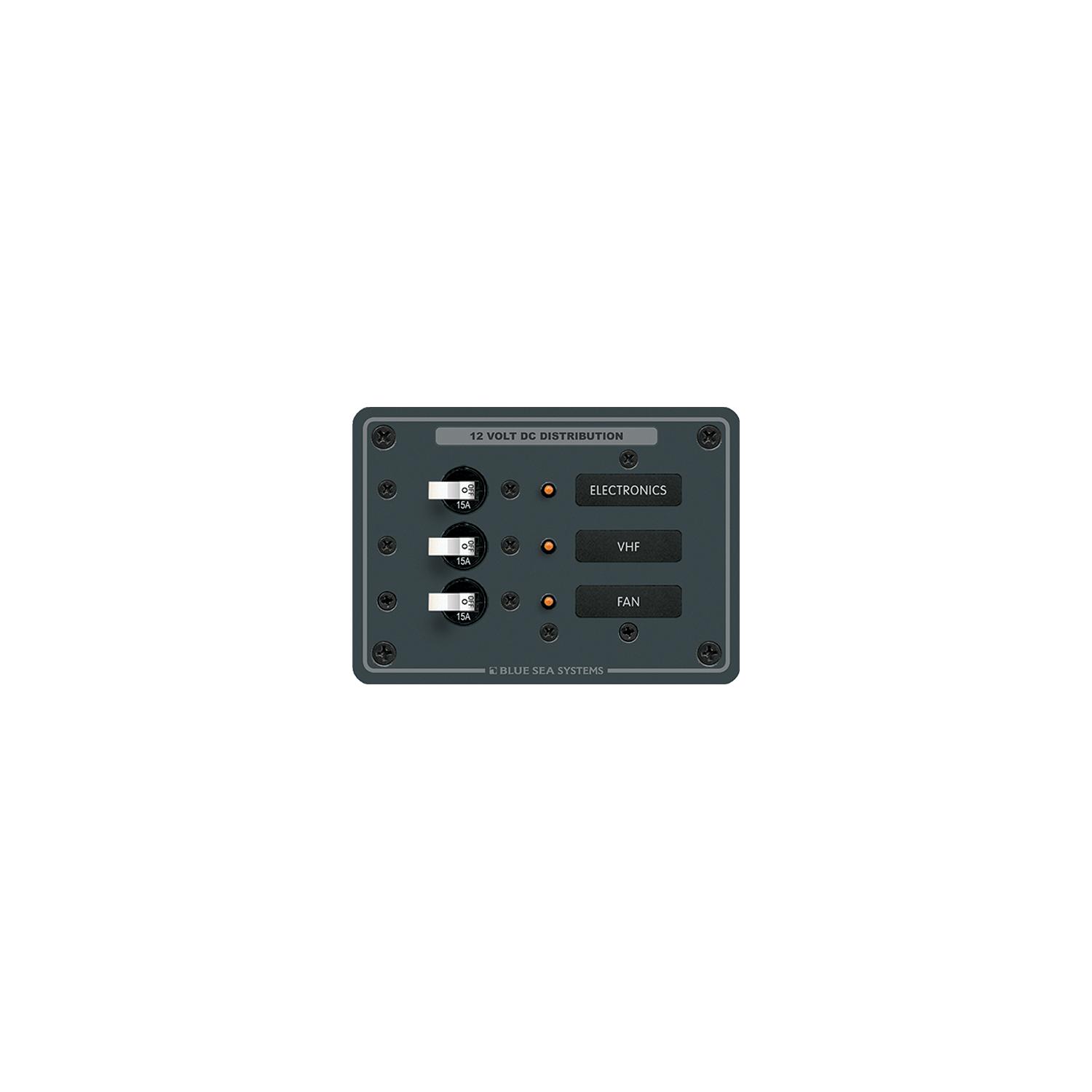 Blue Sea Systems 8025 Traditional Metal DC Circuit Breaker Panel – 3 Positions Traditional metal panels provide DC Branch switching and circuit protection. All positive, negative, and grounding busses installed. Backlit label positions. Includes set of 30 common DC labels. For 12 or 24 Volt DC Systems.