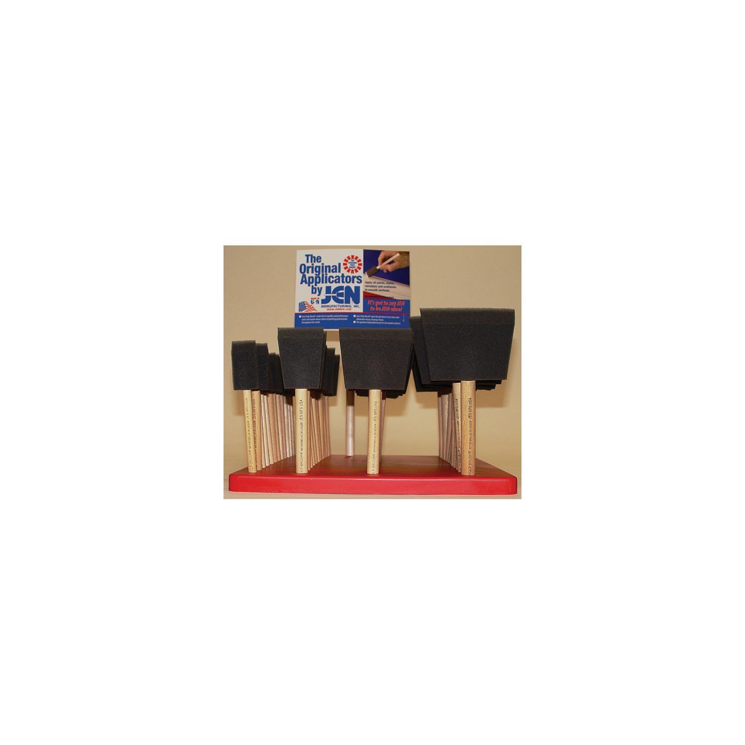 Brush Display Poly Asst. Display includes: 12 ea. of sizes 1″, 2″, 3″ and 4″ brushesThrow-away applicators, for all smooth surfaces. Ideal for application of enamel, latex, stain, oil paints and varnish. Not for shellac or lacquer. Leaves no brush marks or loose bristles. Rollers fit all standard holders. Has less spatter and a smoother finish.