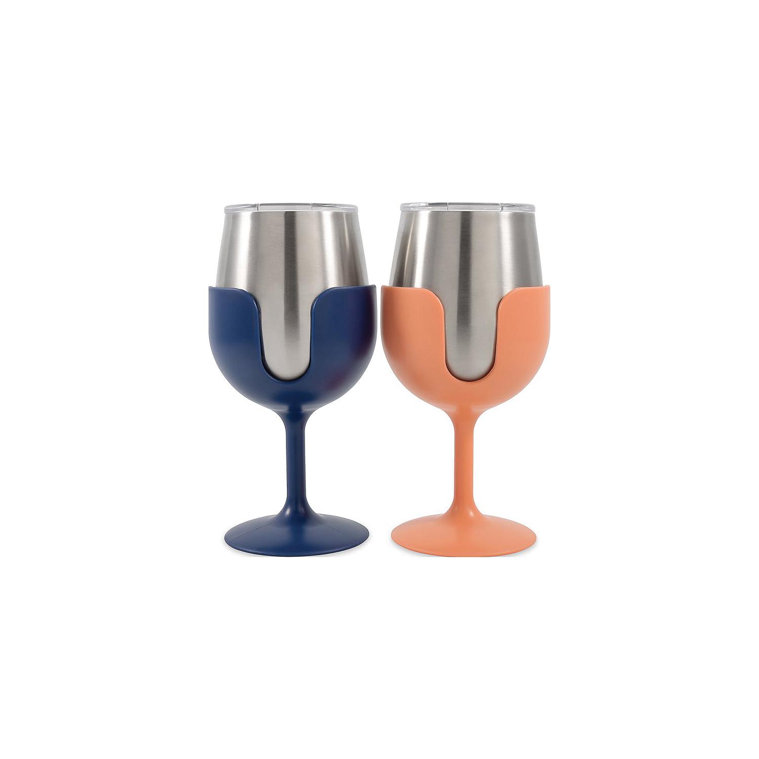 Camco 51917 Wine Tumblers, 8 oz., Navy & Peach, 1 pr. The ultra-durable tumblers made with kitchen grade 18/8 stainless steel and the double walls vacuum insulate your beverage, keeping it hot or cold longer. The tumblers have a flat bottom, so they can be used with or without the stems. Great for picnics, camping, outdoors and anywhere else traditional wine glasses might break.