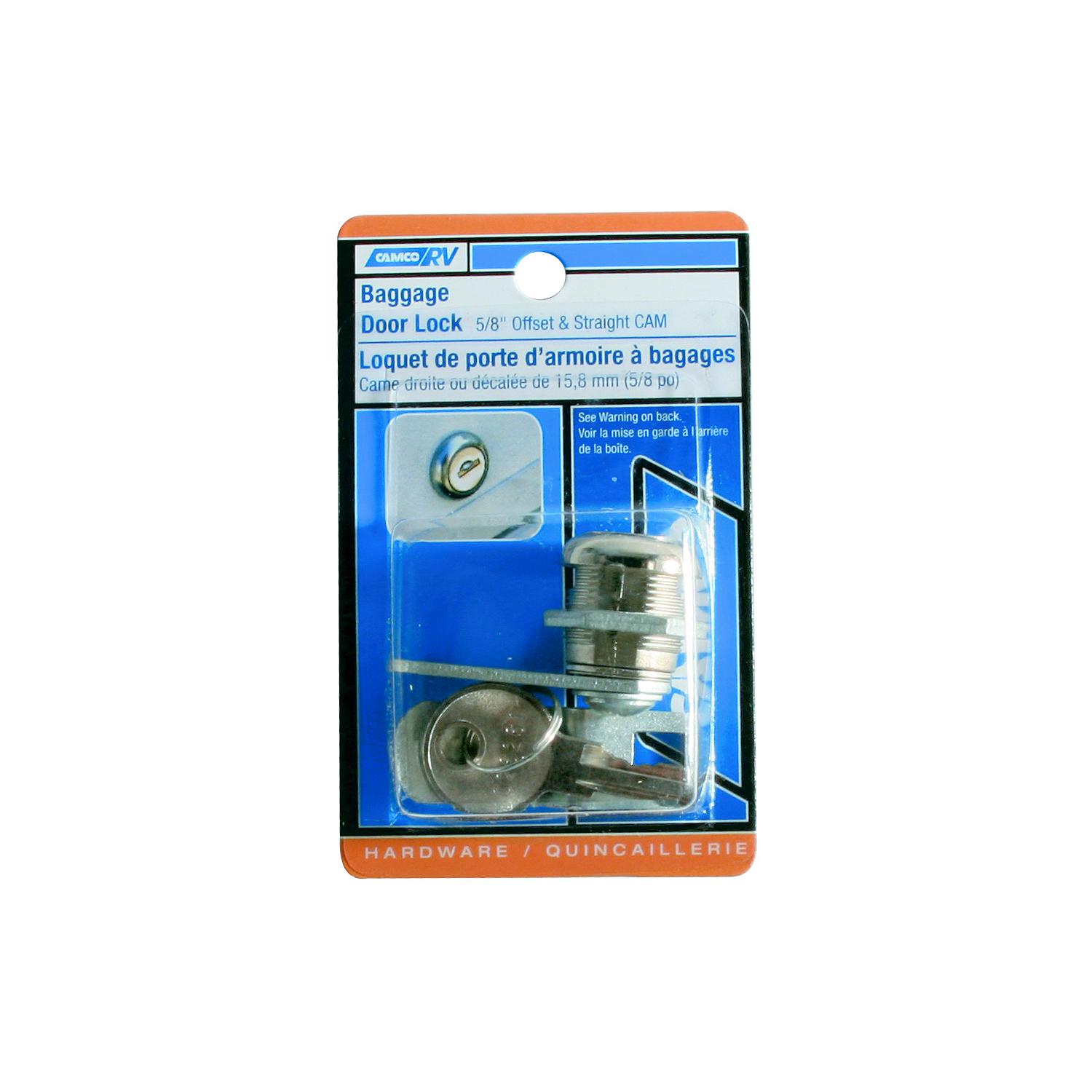 Camco Cam Lock (Contains One Offset and One Straight Cam) Keep your storage compartments secure. Ideal for new or replacement installations on RVs. Easy-turn thumb operated or key-locking styles. Each contains one straight and one offset cam.