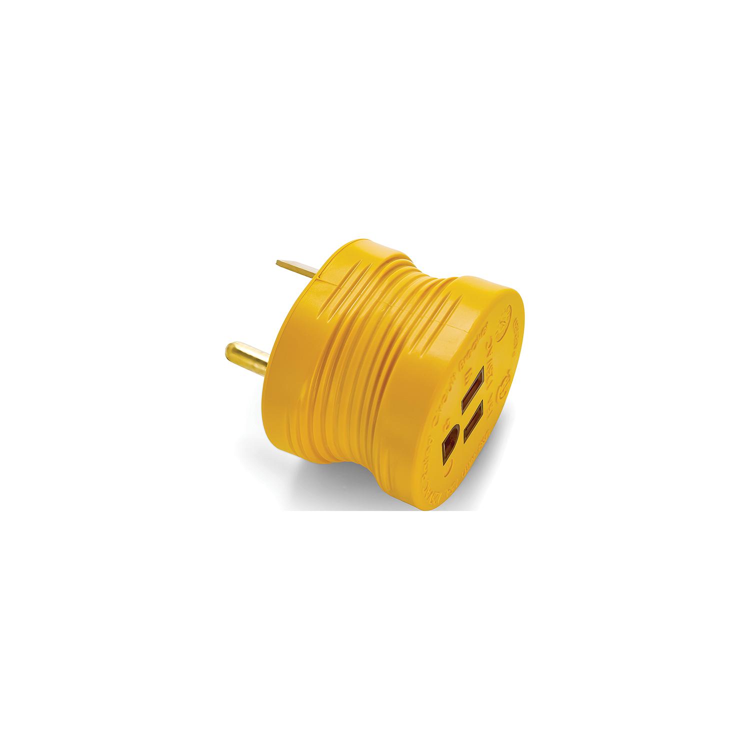 Camco Electrical Adapter, 30A Male, 15A Female Electrical Adapters with contoured shape for easy removal from outlet.