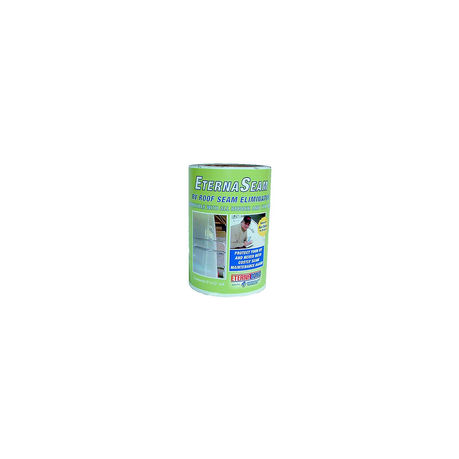 EternaBond EternaSeam Roof Seam Eliminator Question: What is one of your biggest leak concerns with your RV? When (not if) the roof seam is going to leak. Roof seam? What roof seam?99% of all RVs, regardless of what the RV or the roof are made of, have 2 seams, 1 in the front where the fiberglass front roof cap meets the roof over the drivers area, and the same thing in the back. New from the factory these seams are covered with a self-leveling sealant. These sealants have to be scraped off and replaced every 2 to 3 years. How can you eliminate the need for this regular and costly maintenance? Solution: With EternaSeam Roof Seam Eliminator, that worry is gone. EternaSeam, with an extra wide 6″x10′ roll of RoofSeal MicroSealant tape, is specifically designed for front and rear RV roof-cap systems and will permanently seal the seam for years of carefree motoring. The extra width allows the installer to go right over the old sealant (except silicone). No more costly yearly seam maintenance. EternaSeam comes in a convenient 6″ x10′ roll with a scoring pad, plastic squeegee, 2 oz. tube of caulk, and an RV-EMT instruction sheet.
