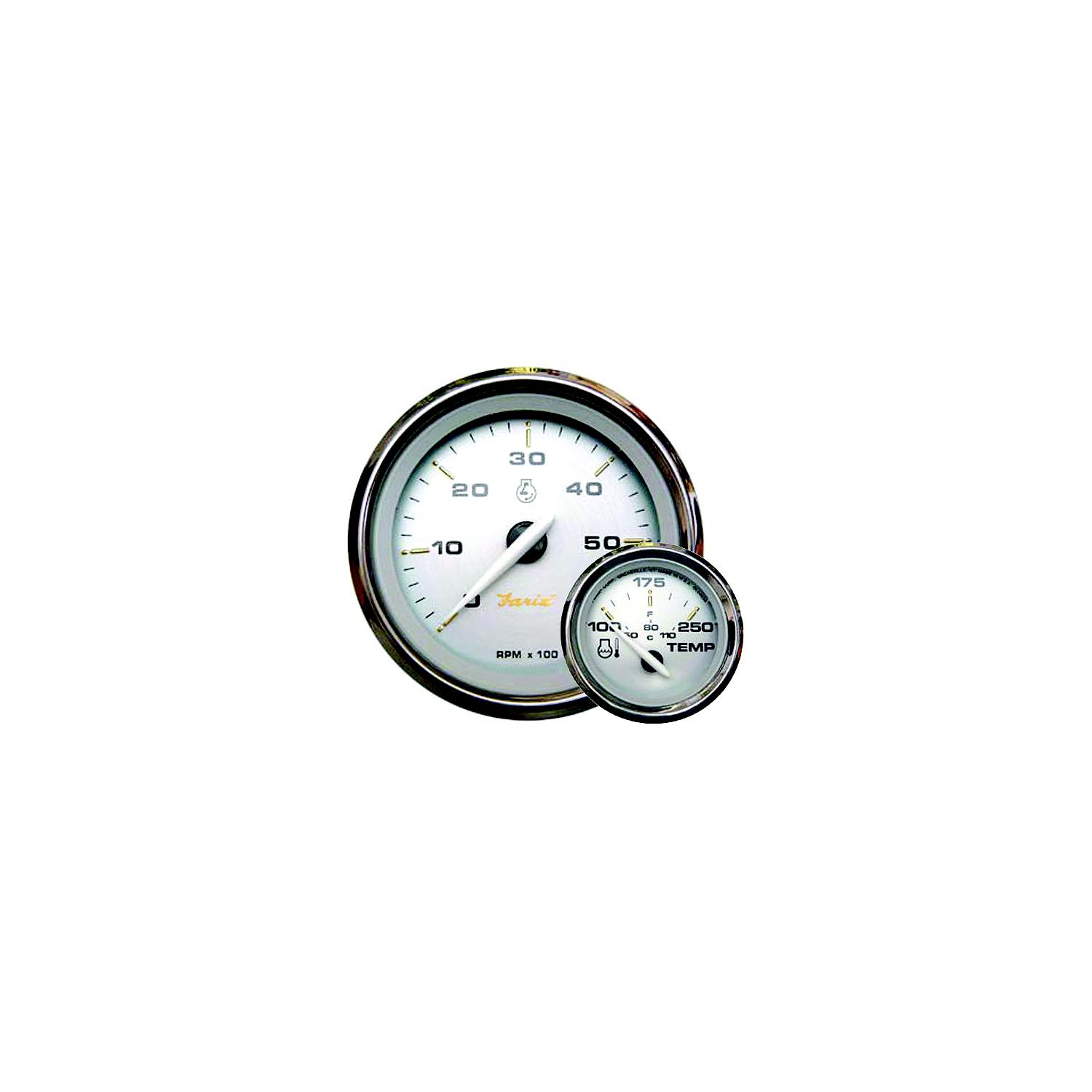 Faria Kronos 6 Gauge Inboard Set Perimeter-lighted aluminum dials with gold and black graphics, stainless steel bezels and stylized pointers. Manufactured with flat glass lens. This elegant style adds a touch of style to any dash. Inboard Boxed Set includes:4″ Speedo (60 MPH-Mech), 4″ Tach (6000 RPM), 2″ Fuel Level, Voltmeter (10-16 VDC), 2″ Water Temp (100-250 F), 2″ Oil Pressure (80 PSI)