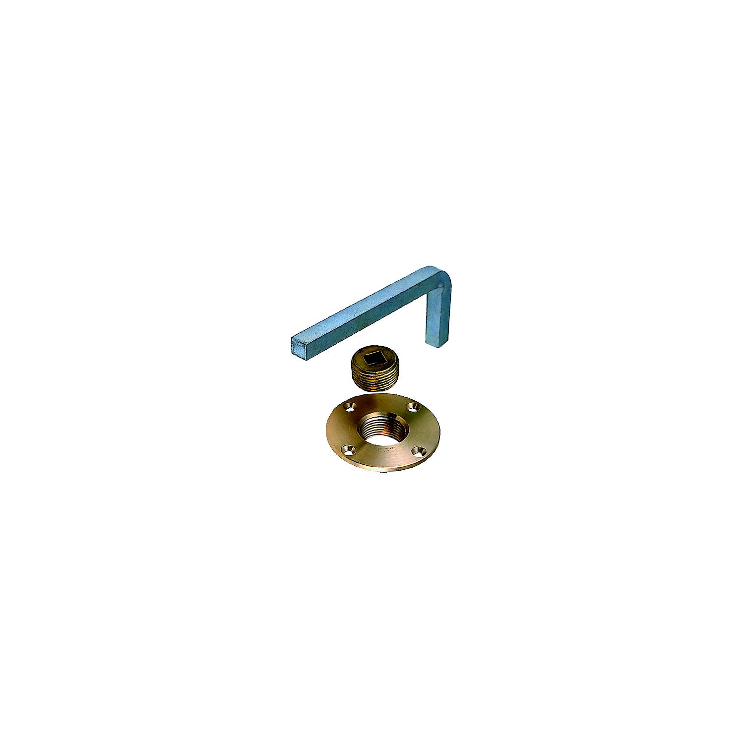 Garboard Drain Plug Cast bronze flange and brass plug. Complete with zinc plated steel wrench. Screw size is 10. Threaded neck is 1″. Pipe size is 1″. Flange O.D. is 3-1/8″.