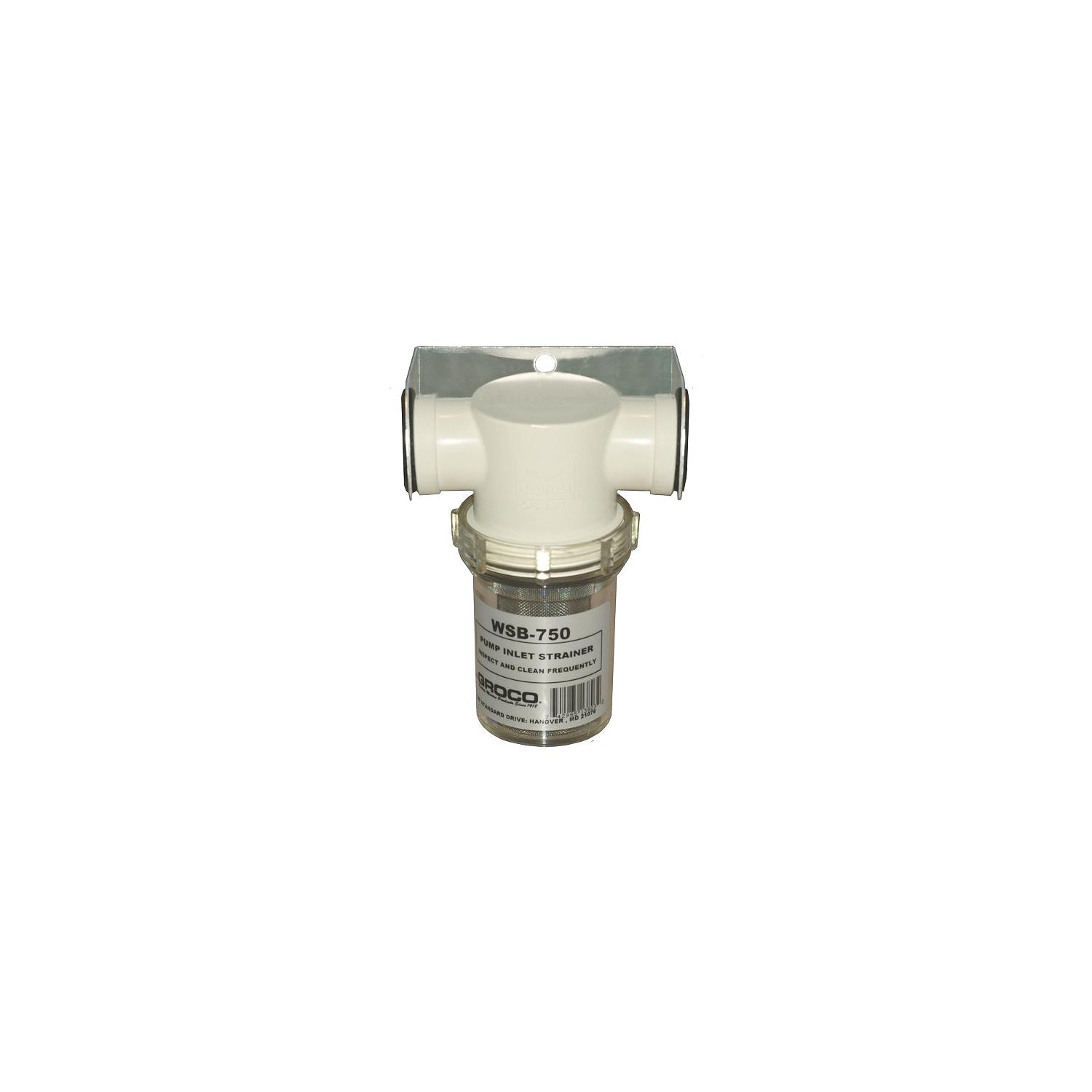 Groco WSB500 Salt-Water Pump Strainer With Stainless Steel Basket Protect fresh water pumps from debris. White nylon strainer head and clear plastic sight glass. Glass unscrews for filter basket cleaning. Mounting bracket included.