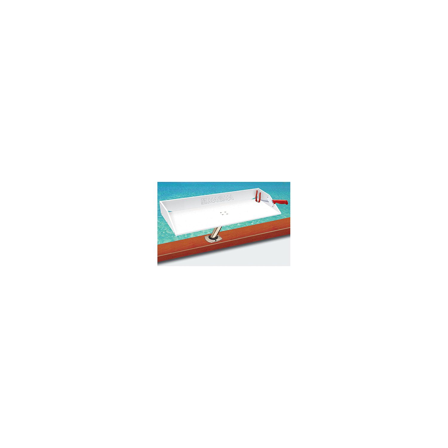 Magma Black and White Bait/Filet Mate Table With LeveLock All Angle Adjustable Fish Rod Holder Mount, Built-in Ruler, and Knife & Pliers Slots Excellent for filleting fish or serving food. The “Combo” includes an FDA approved, high-density, polyethylene table and Magma’s exclusive Levelock all angle fish rod holder mount. Features two fillet knife holders and a receptacle for your fishing pliers. A slot at the back permits water drainage, will not absorb fish odors, and will not crack or mildew. The 1-1/2″ stainless tube fits into most “cross pin” type rod holders. Folds flat for storage.