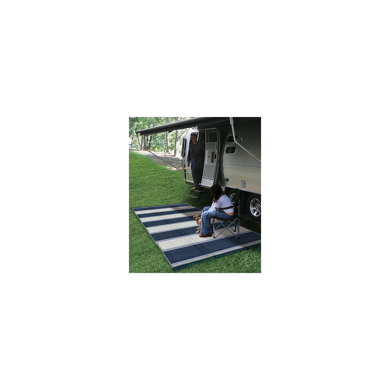 Open Air Stripe Awning Leisure Mat, 6′ x 9′ Blue Reversible, lightweight and easy to clean. Mold and mildew resistant; perfect for putting by your RV, at your campsite or on your patio. Folds easily for storage.