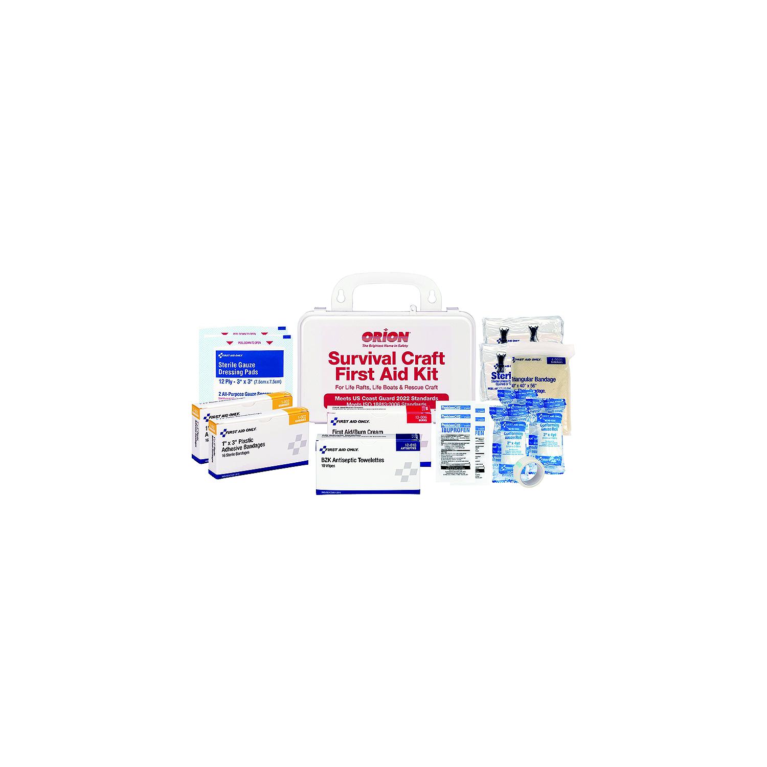 Orion 816 Survival Craft First Aid Kit Includes: (32) Adhesive Bandages, 1? x 3?, (10) Antiseptic Wipes, (50) Ibuprofen Tablets, (12) Burn Cream Packets, (10) Sterile Gauze Pads, 3?, (3) Bandage Compresses, 2? x 4yd, (3) Bandage Compresses, 3? x 4yd, (2) Sterile Gauze Compress, 4? x 72? wrap with 4? x 8? pad, (2) Triangular Bandages, 40? x 40? x 56?, (1) Waterproof Tape, 1/2? x 5yd, (1) Weatherproof Case, 8? x 5? x 3?