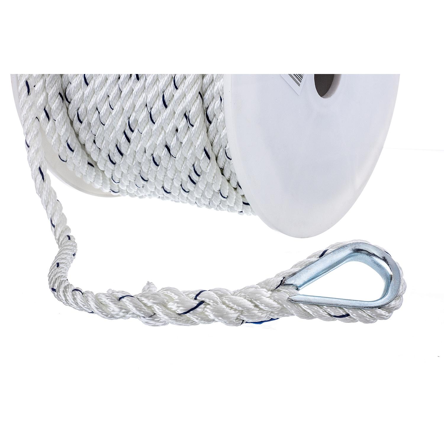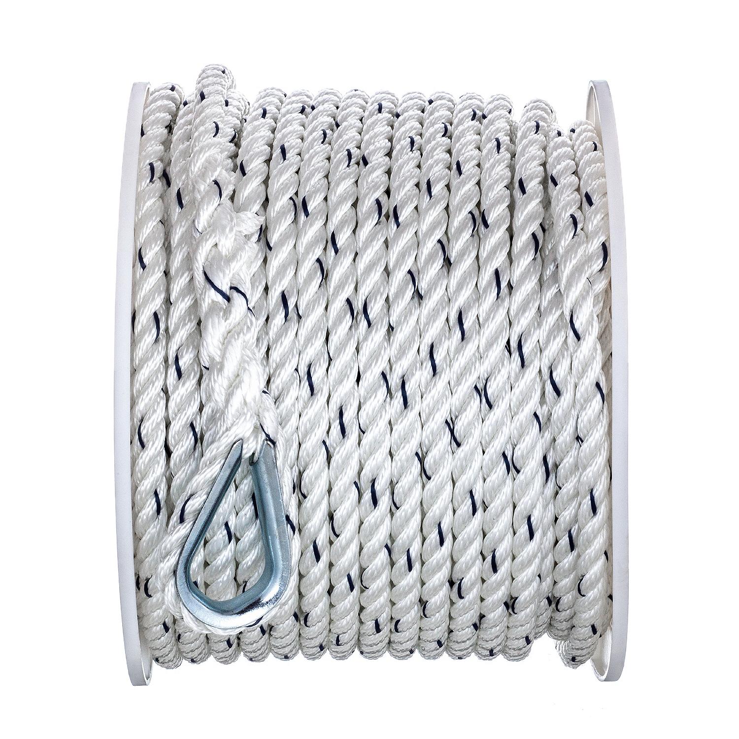 Premium 3-Strand Twisted Nylon Anchor Line White With Blue Tracer, 3/8″ x 150′