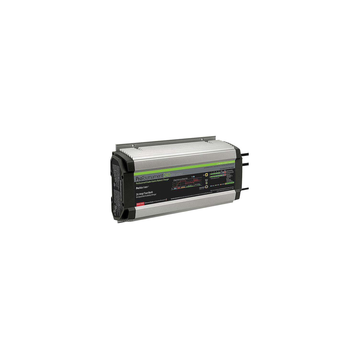 Promariner 53244 ProTournament Elite Series 3 Battery Charger, 4-Banks, 24 Amps ProTournamentelitedelivers true rated output amperage with Distributed-On-Demand charging Technology with the fastest charge times in its class. ProTournamenteliteboasts an industry first LED Charge Status AC Glow Plug, that when connected to an extension cord outside of your boat, illuminates 3 individual colors for charging, conditioning or auto maintaining your fully charged batteries.