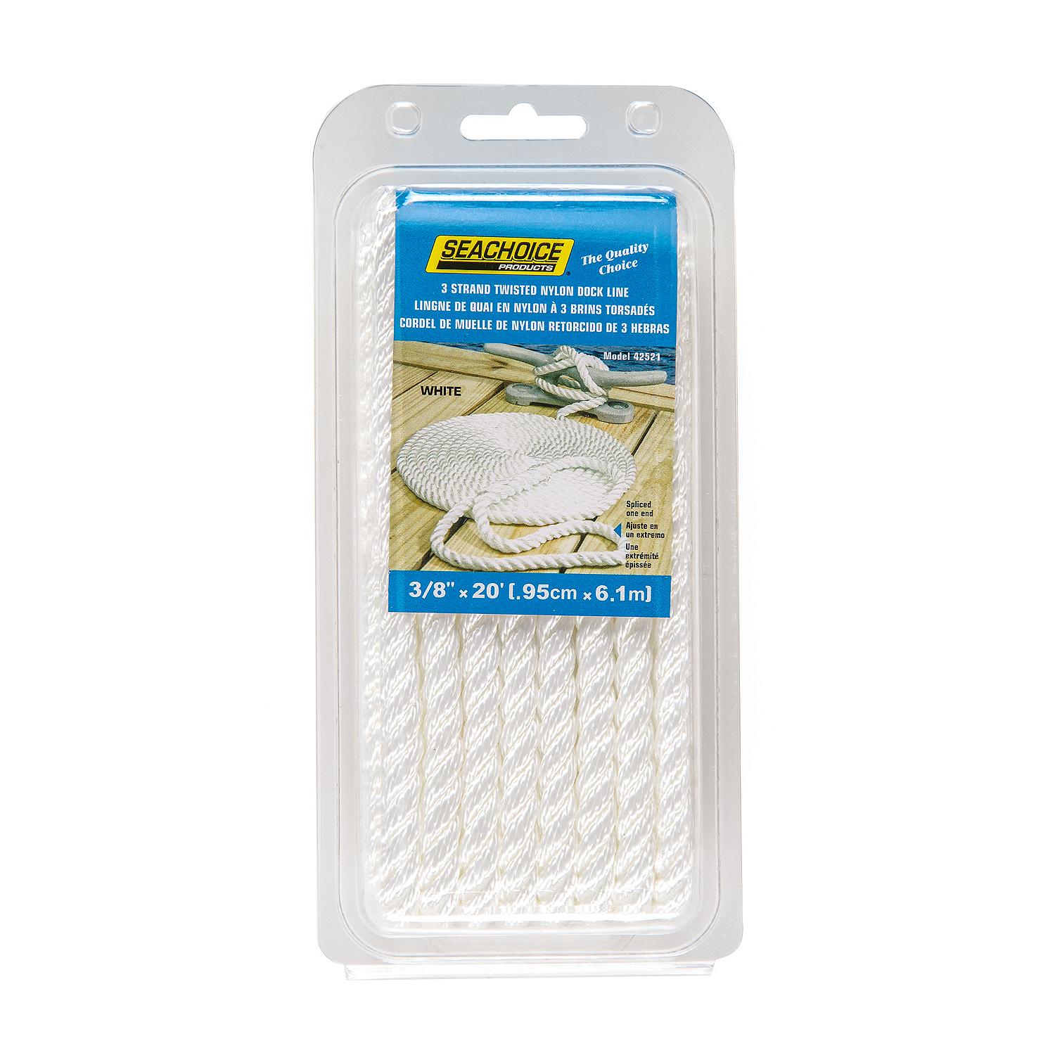 Seachoice 3-Strand Twisted Nylon Dock LineWhite Extremely strong rope with 10″ eye splice (3/8″ rope: 18″ eye splice). Designed to absorb sudden shock loads. Very good resistance to abrasion, rot, oils, gasoline and marine growth. Clamshell packed.