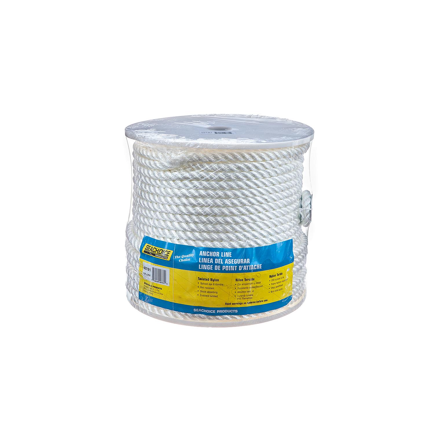 Seachoice 40781 3-Strand Twisted Nylon Anchor Line – White, 1/2″ x 250′ Extremely strong line designed to absorb sudden shock loads. Comes with galvanized steel thimble.