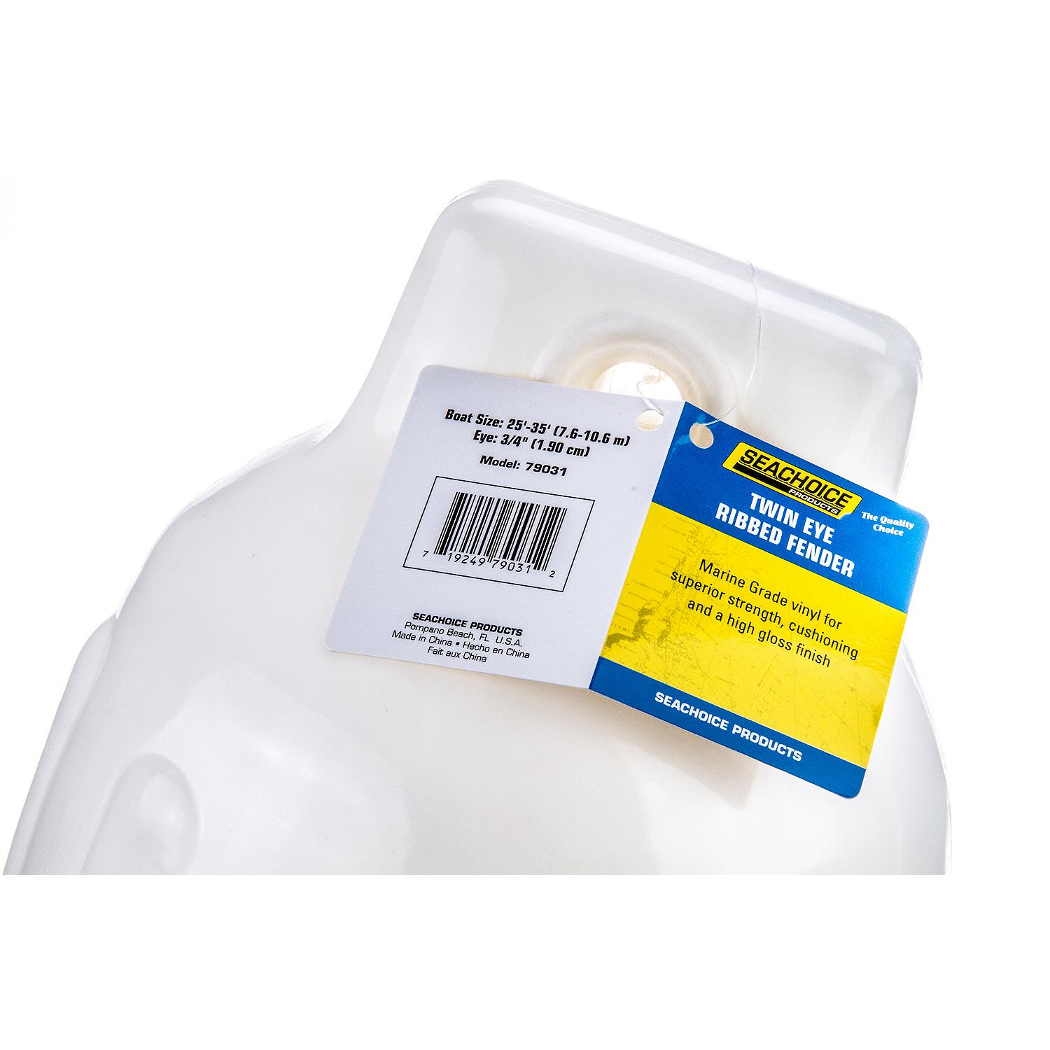 Seachoice 79031 Twin Eye Ribbed Fender, White, 8.5 x 27″ Roto-molded fenders are manufactured from Marine Grade vinyl for superior strength, cushioning and a high gloss finish. Recessed valve to prevent valve lug from pulling away from fender. Valve plug housing molded into fender. Heavy-duty integral lugs for longer durability. Rotomolded for even wall thickness. Unique quality ribbed material ensures softness.