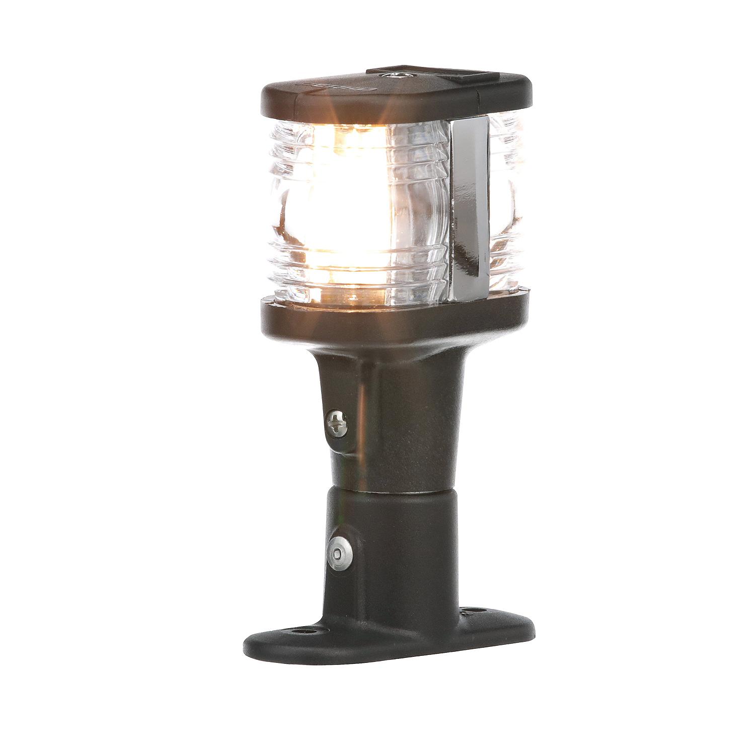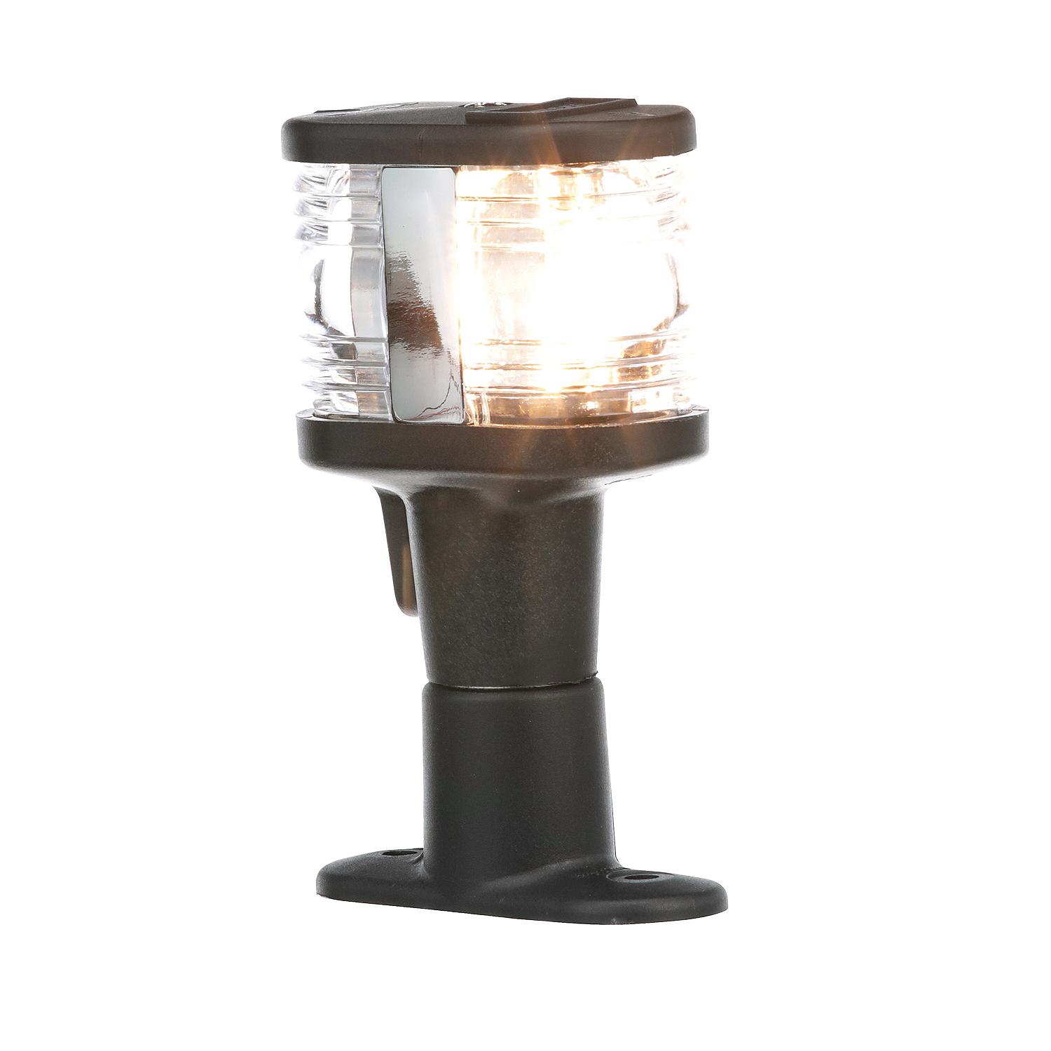Seachoice Black Polycarbonate Masthead and All-Round White Light Meets CE and USCG requirements for 3NM visibility for sail or powerboats under 66′. Meets NMMA Certification Procedure. Clear lens. Two 12V DC – 8 CP lamps included. Base Size: 1″ x 2-5/8″. Light and base made of UV resistant black polycarbonate. Height: 4″.