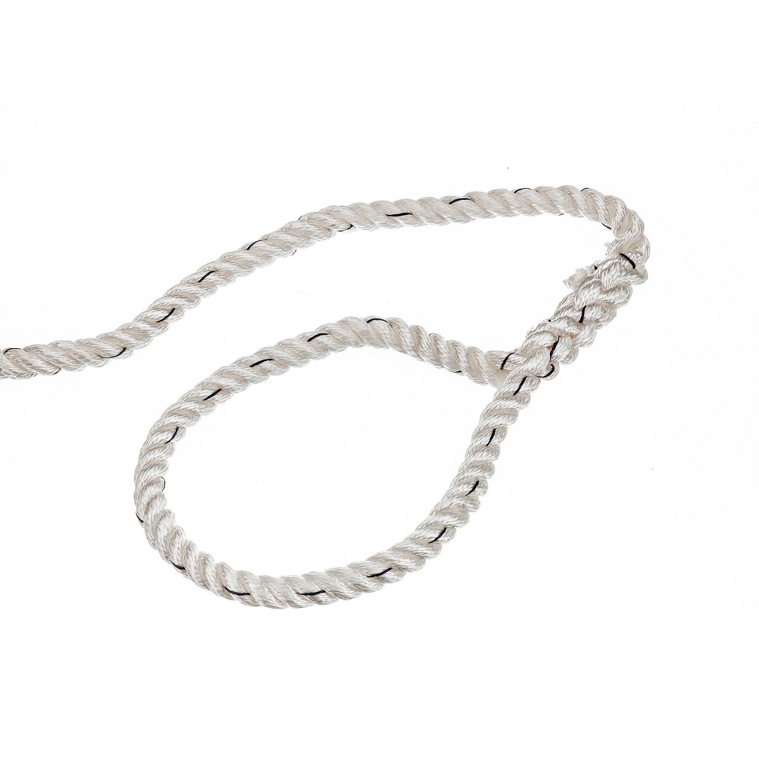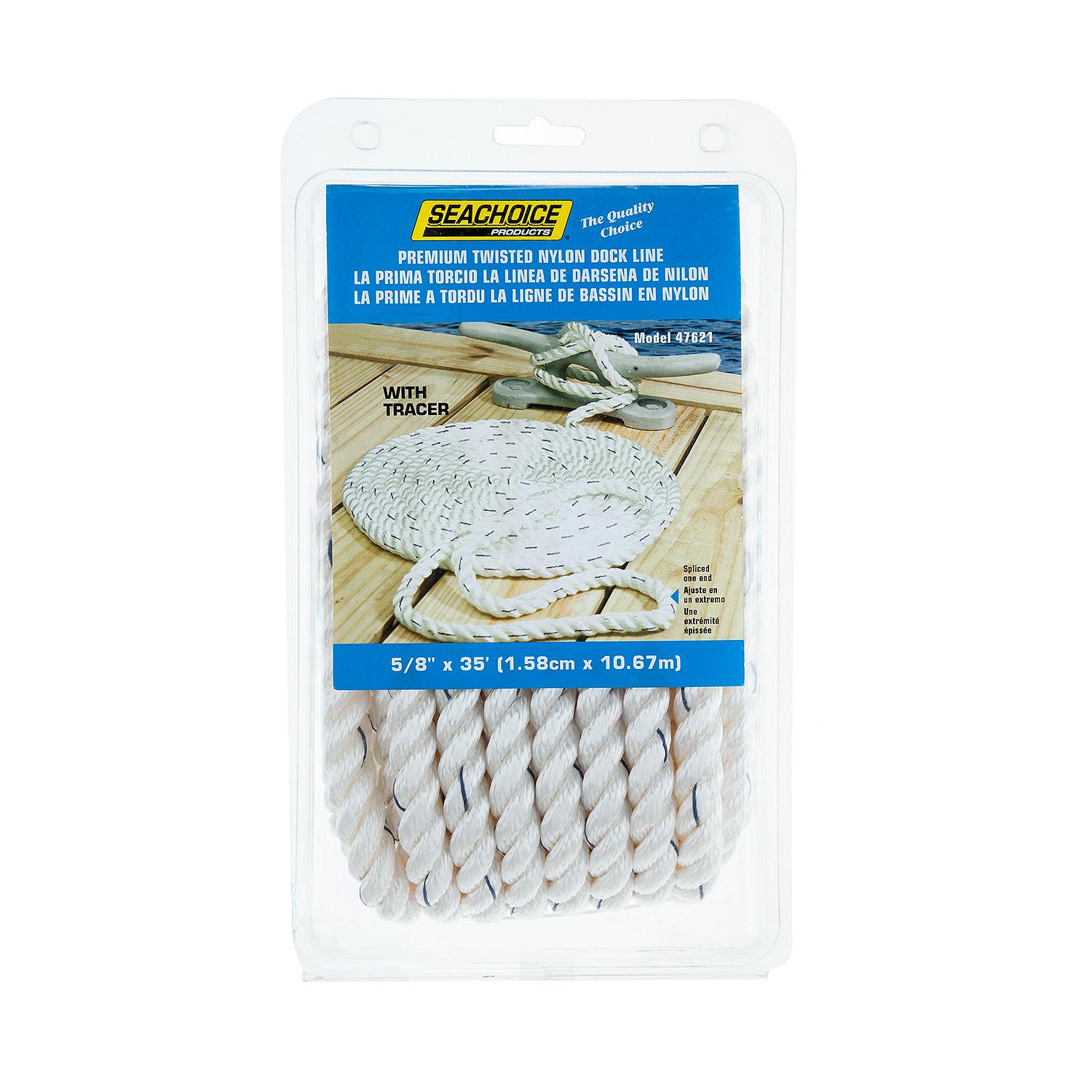 Seachoice Premium 3 Strand Twisted Nylon Dock Line – White With Blue Tracer Extremely strong rope with 10″ eye splice (5/8″ rope: 18″ eye splice). Designed to absorb sudden shock loads. Very good resistance to abrasion, rot, oils, gasoline and marine growth. Clamshell packed. White with contrasting blue tracer.