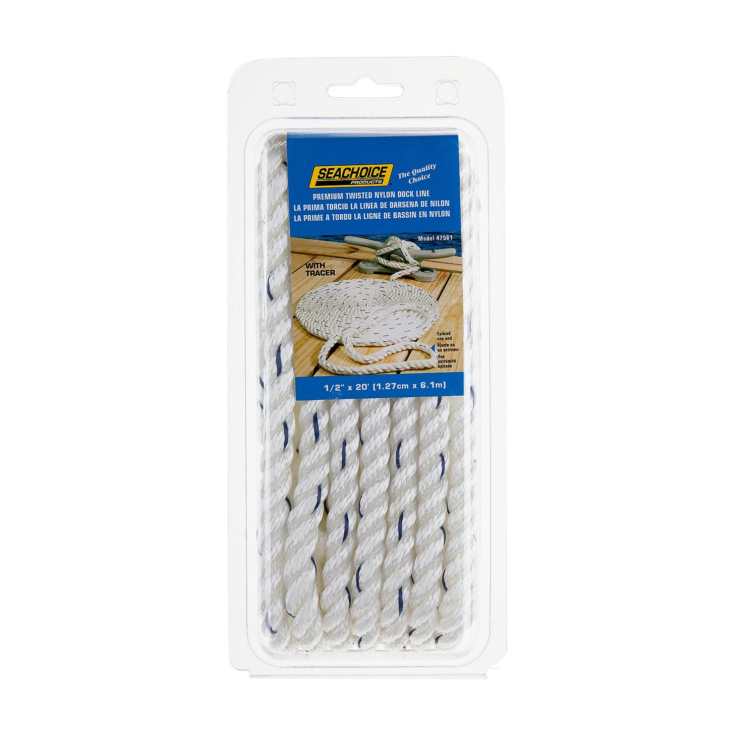 Seachoice Premium 3 Strand Twisted Nylon Dock Line – White With Blue Tracer Extremely strong rope with 10″ eye splice (1/2″ rope: 18″ eye splice). Designed to absorb sudden shock loads. Very good resistance to abrasion, rot, oils, gasoline and marine growth. Clamshell packed. White with contrasting blue tracer.