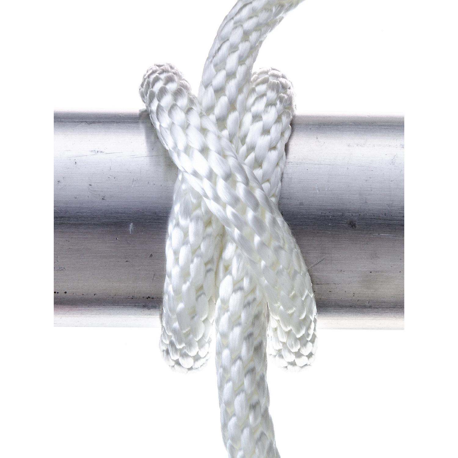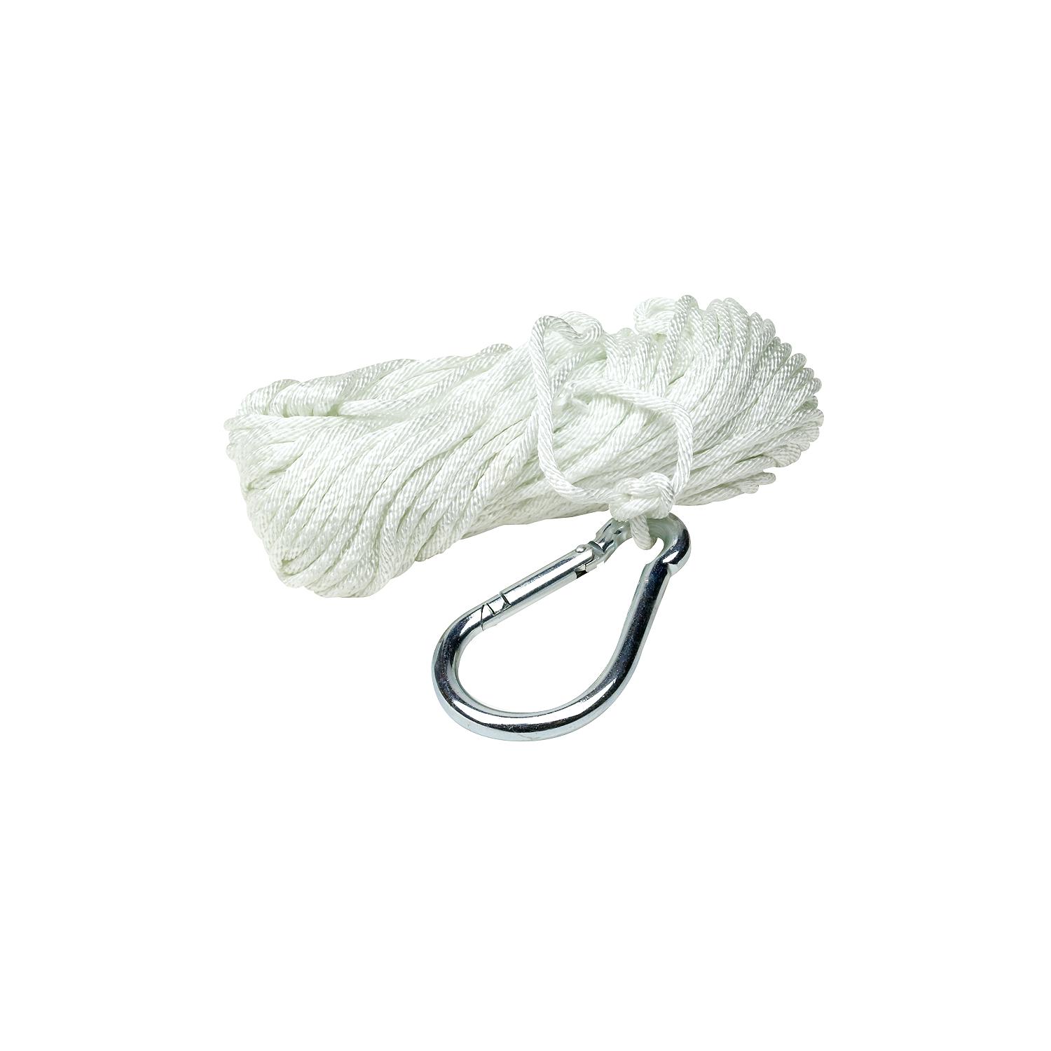 White, 3/8″ x 50′ Solid nylon braid. Rot proof and abrasion resistant. Zinc galvanized spring hook.