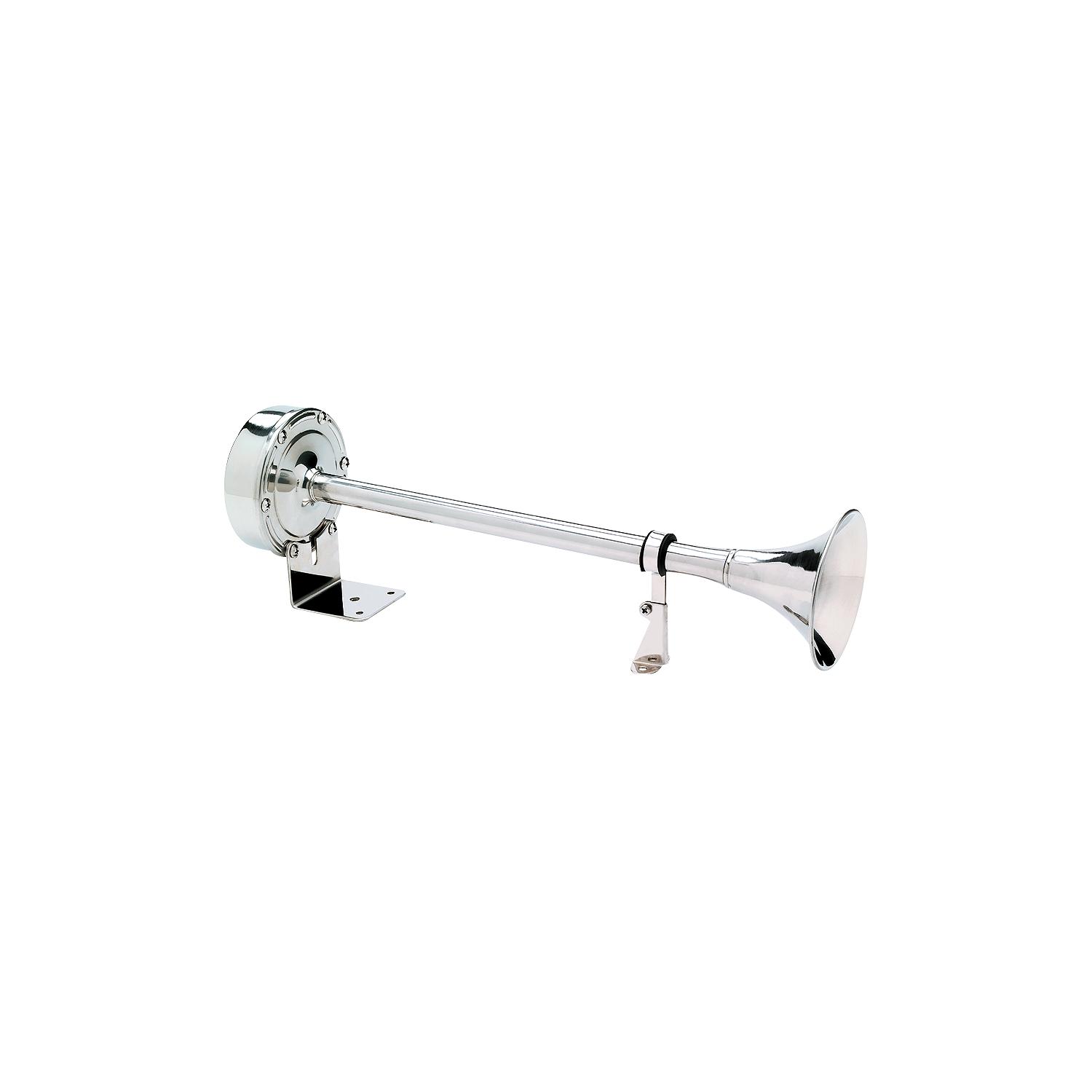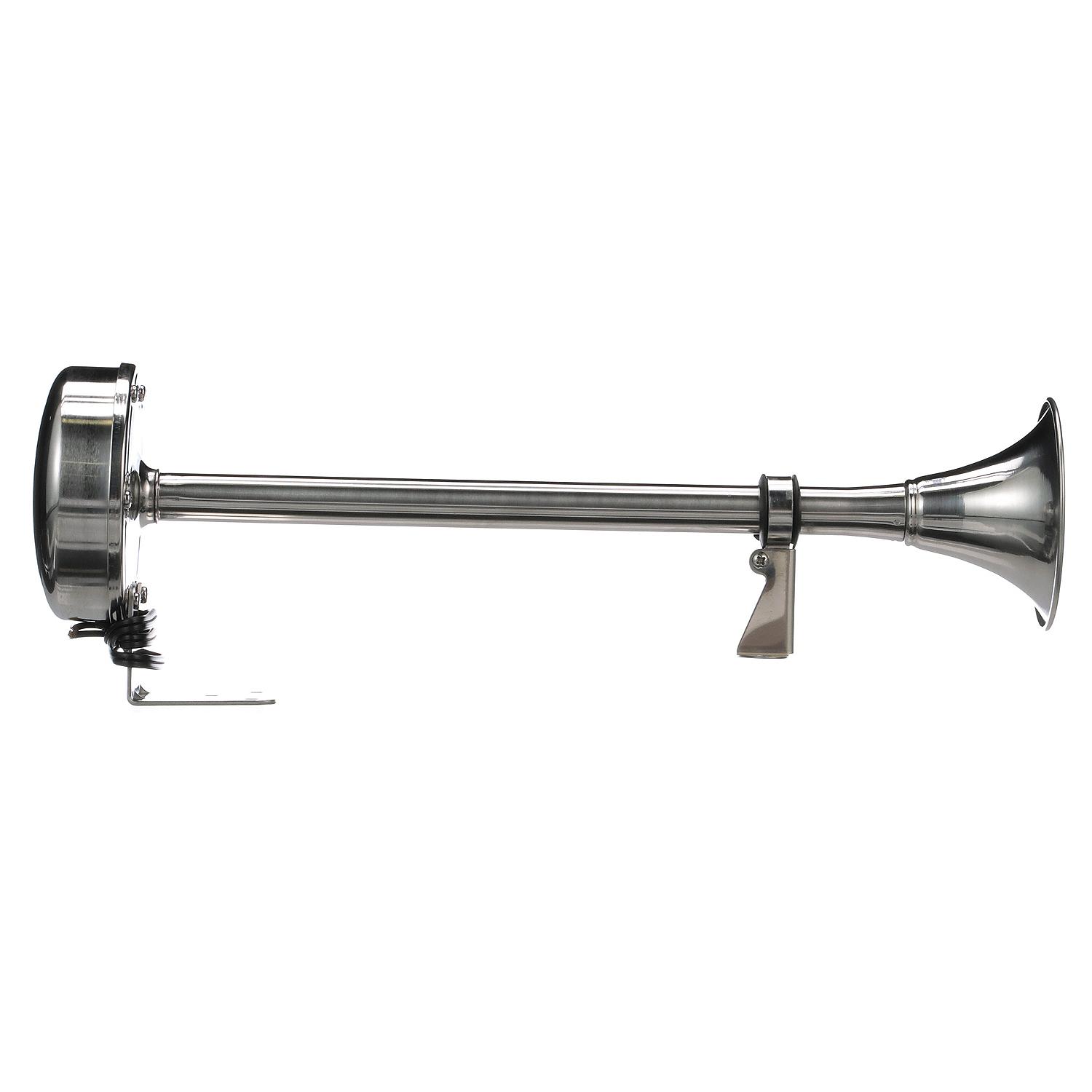 Seachoie 14541 12V Trumpet Horn All stainless steel trumpet tube, mounting bracket and motor cover. Vibration free mounting with rubber pad. 12V DC. Fastens with #10 screws.