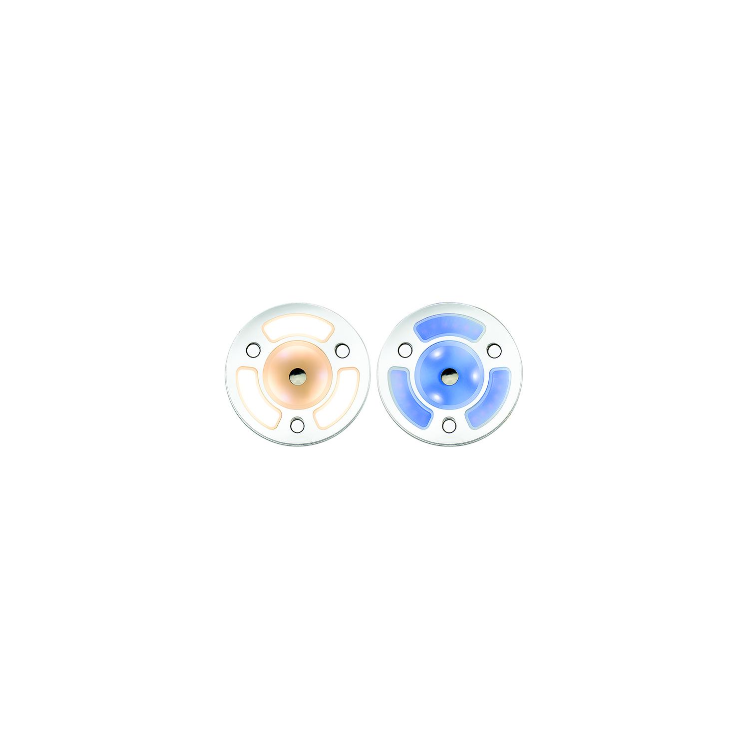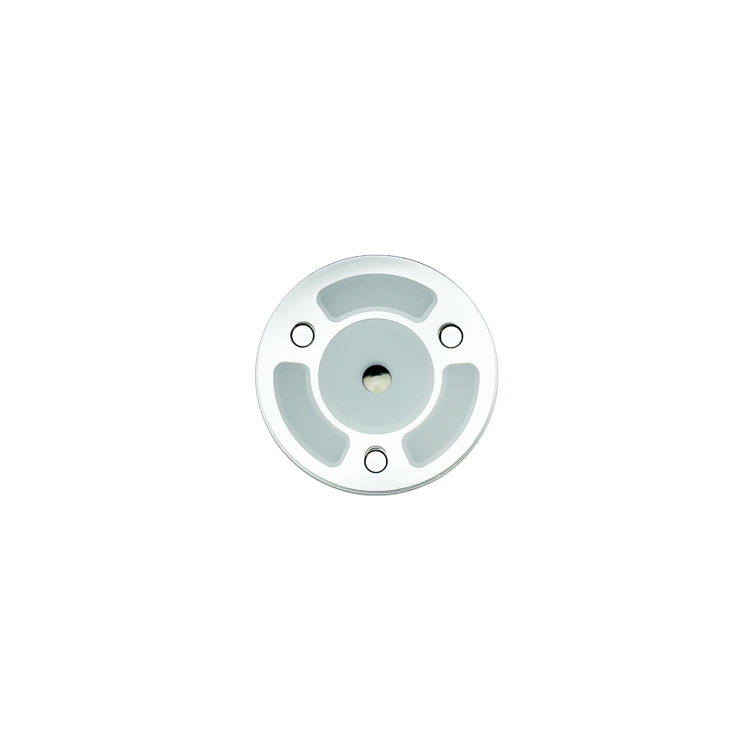 Seadog 4018353 LED Mirror Light With Dimmer, 4″ Round This LED Mirror Light features white and blue LED lights with a built-in, touch controlled on/dim/off switch. Touch the center button to switch between white, blue, and off. Continue to touch button to activate dimmer. Works with 12V and 24V systems. Includes three #6 FH fasteners and white hole plugs. CE, RoHS compliant. 3000K, 300 lumens.