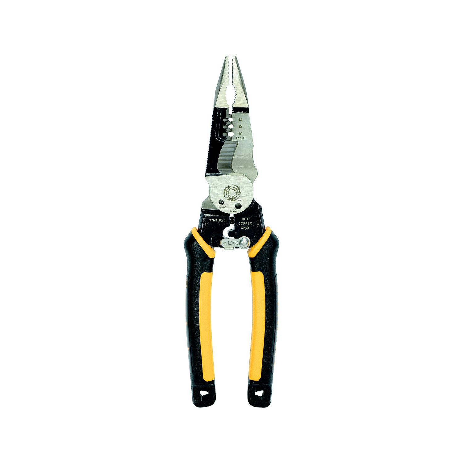 Southwire S7N1HD 7-In-1 Multi Tool Pliers The 7-In-1 multi-tool pliers are perfect for stripping, shearing, gripping, crimping, reaming, and spanning and shearing bolts. The scalloped blade cuts easily and efficiently. These multi-tool pliers come with tether ready handles for drop prevention. Heavy duty forged steel stands up against rugged work environments. Strips 10-14 AWG SOL & 12-16 AWG STR. Shears 6-32 & 8-32 Bolts.