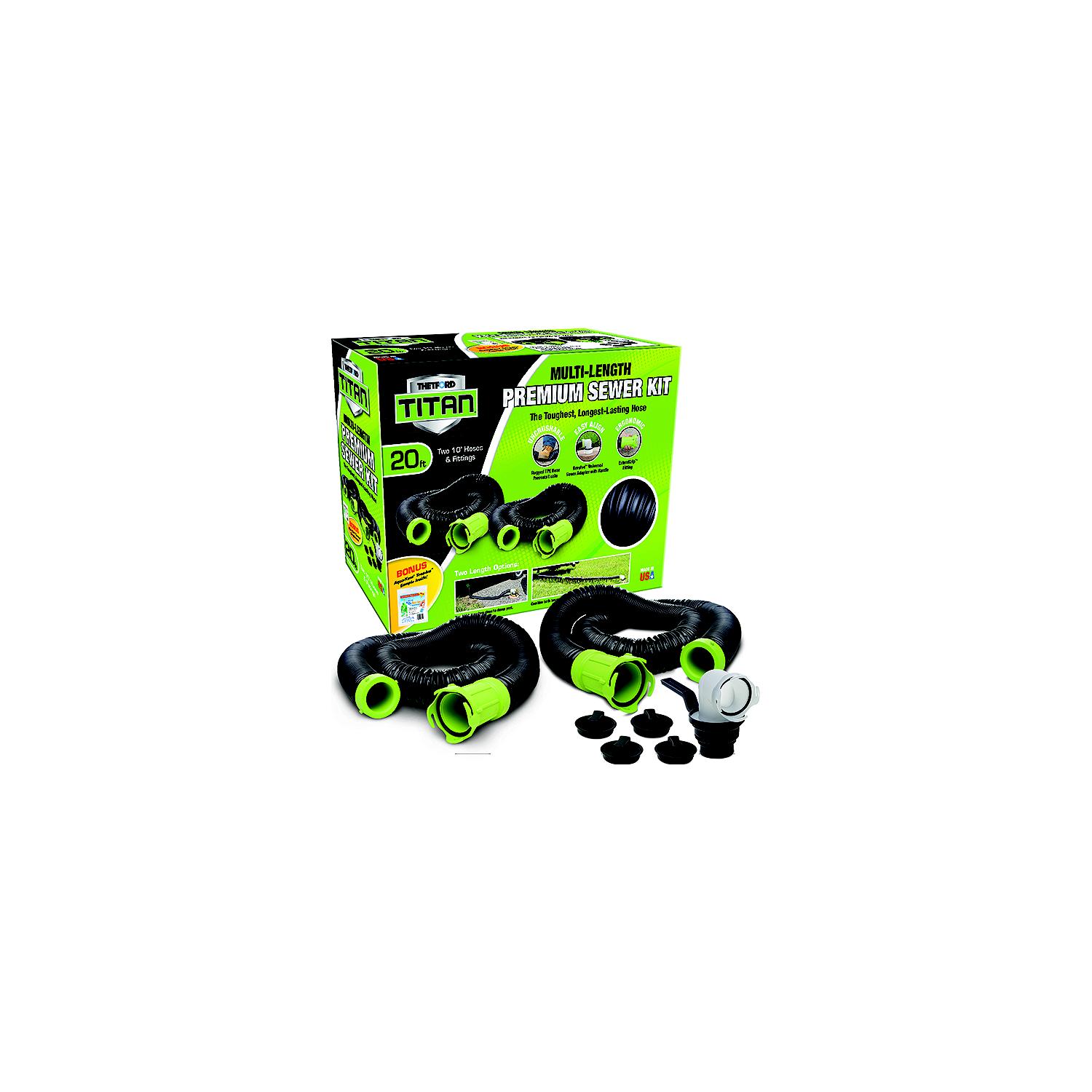 Thetford 17902 Titan 20′ Pemium RV Sewer Kit System Thetford Titan is exactly what you need to make emptying holding tanks more pleasant and it’s premium quality features are what RVers have come to expect. Proprietary TPE properties provide the highest degree of puncture and abrasion resistance, and help Titan excel in extreme temperatures. Titan is the toughest, longest-lasting, best-value sewer hose on the market. Includes: 2 rugged 10′ TPE hose; 1 Revolve 5-in-1 sewer adapter w/exclusive handle; 4 secure, versatile end caps