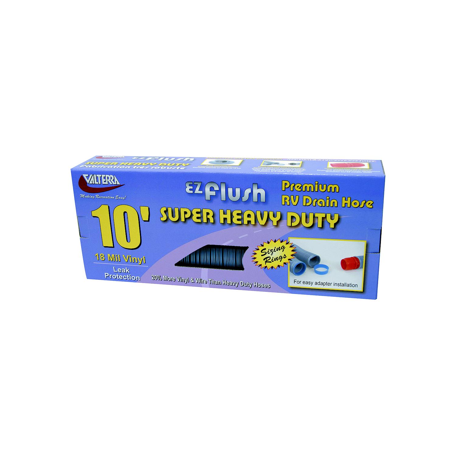 Valterra Slate Blue E-Z Flush Super Heavy Duty RV Drain Hose with Sizing Rings & 90 Degree Sewer Adapter Ideal for full-time and semi-permanent RVing. 18 Mil vinyl cover. Includes sizing rings for hassle free adapter installation.