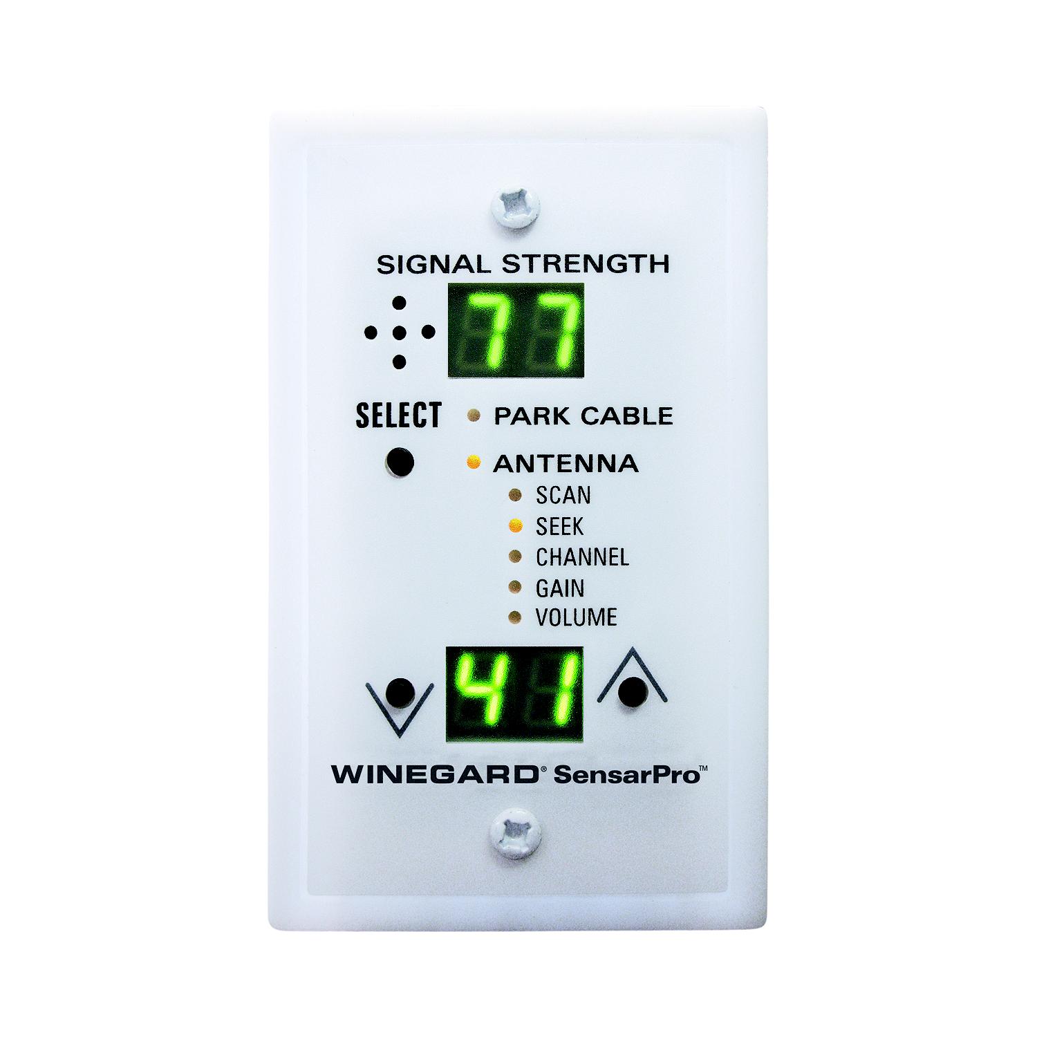 Winegard RFL-332 Black SensarPro RV TV Signal Meter Designed to work with all amplified Sensar antennas, the SensarPro replaces your current power supply and makes peaking on digital channels a breeze. SensarPro is an all in one product that acts as a signal meter, adjustable amplifier and wall plate power supply for your Sensar antenna. It is ready out of the box and can be customized for specific search modes eliminating guesswork and frustration. Built in amplification can give you up to 10 dB of gain for increased performance or the ability to lower the gain when positioned near a tower. Adjustable audio feedback comes in handy when the wall plate is out of sight or reach. High grade electronic digital tuner focuses only on U.S. digital broadcast frequencies and ignores non-TV broadcast signals to provide precise and accurate channel readings. Proudly designed, tested and built in the U.S.A.